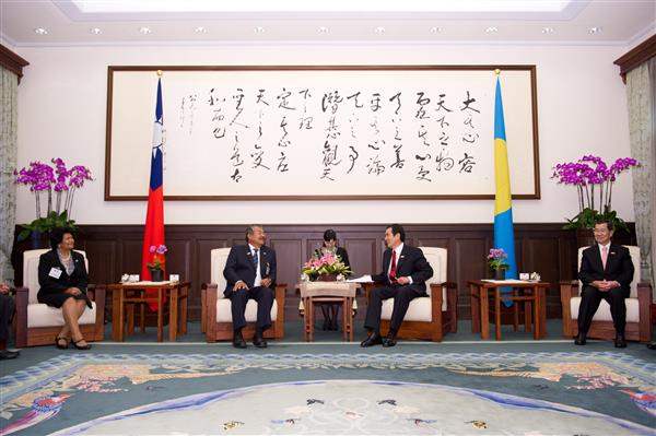 隨後,馬總統與帛琉共和國總統陶瑞賓會談時,也對雙方多年的密切合作,表達肯定與欣慰之意。總統指出,我國長期協助帛琉修建道路、碼頭,提供運輸船暢通島際交通,並合作開發再生能源,加上目前刻正推動的一盞燈計畫,顯見彼此的合作成果相當豐碩。