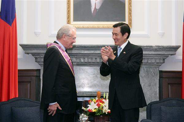 馬英九總統上午頒贈美國前國防部長倫斯斐(Donald Rumsfeld)「大綬景星勳章」,表彰其促進臺美友好合作關係的卓越貢獻。