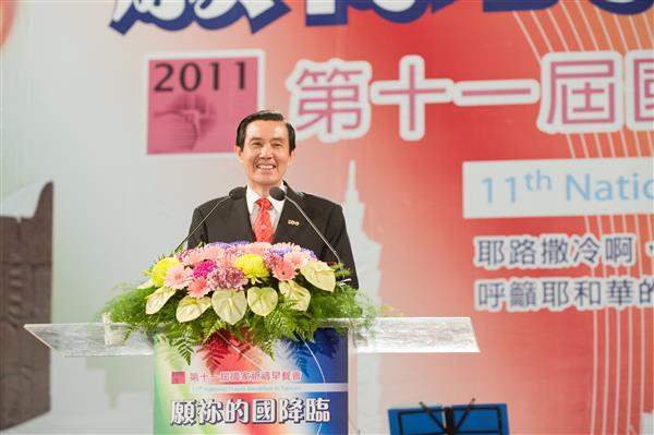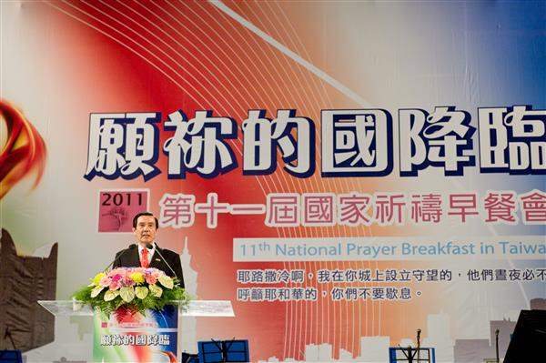 馬英九總統上午出席「第11屆國家祈禱早餐會」,與來自國內外的數千名教友共同為臺灣祈福,並期盼國內各界一起努力,使社會向上提升、人民脫胎換骨,落實人類核心價值。