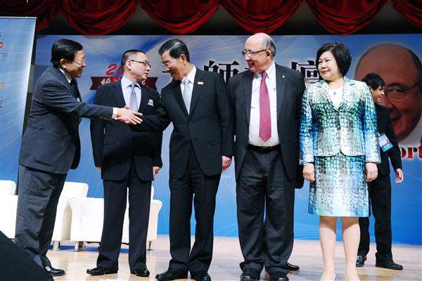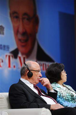 蕭萬長副總統上午出席由臺灣金控、經濟日報及中華經濟研究院共同合辦的「2011年大師論壇-『跨越百年.再造榮景』高峰會」開幕典禮,並期盼以研究勞動經濟學著稱的戴爾‧摩坦森(Dr. Dale T. Mortensen)博士,能對我國制定就業等相關政策提供真知灼見。