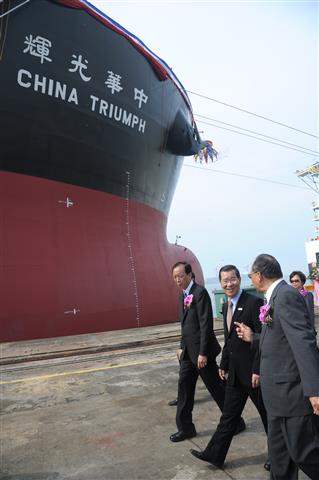 副總統指出,中國航運與台灣國際造船公司的前身中船公司也有相當的淵源;中航在1970和1980年代積極響應政府「國輪國造,國貨國運」的政策,向中船公司先後訂造了一艘四萬噸級,也是我國第一艘自建的新型全貨櫃輪,以及兩艘15萬1千噸級,並為當時中船所建造最大噸位的散裝船;今天中航再度委託台船建造完成「中華光輝」及「中華鴻運」等兩艘新船,做為中華民國建國100年的獻禮,他特別要代表政府對彭董事長的愛國精神與中航持續支持「國船國造」的作法,以及台船公司馳名國際的造船技術與能力,表示肯定。