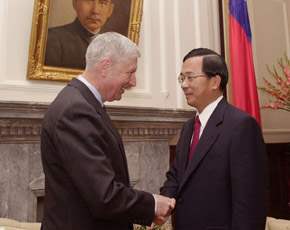 陳總統水扁先生今天接見荷蘭前總理范奈格(Aderas Van Agt),對訪賓再度來華訪問,代表我國政府與人民,表達歡迎之意。