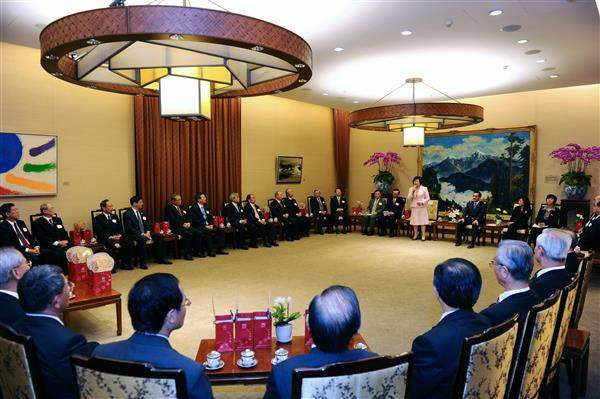 訪賓一行下午由行政院金管會副主委李紀珠、中華民國銀行公會理事長張秀蓮陪同,前來總統府晉見總統,總統府副秘書長劉寶貴也在座。