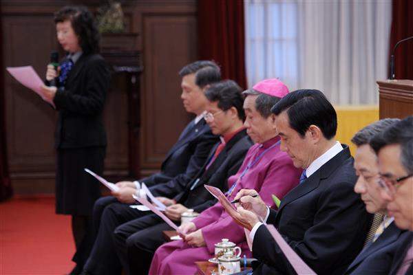 會中,訪賓由鄭貴英長老(基督教暖暖長老會)代表向總統宣讀呈文,朱台深牧師(基督教臺北榮耀堂)及吳錤長老(國際基甸會中華民國總會)分別致贈總統「基督教與辛亥百年同行的軌跡」書籍影片與「聖經」,並由賴榮信主教(臺灣聖公會)為總統與國家祈福。