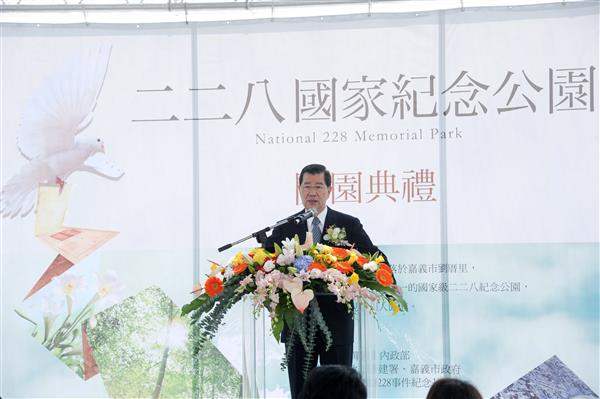 隨後,副總統與內政部長江宜樺、中央選舉委員會主任委員張博雅、嘉義市長黃敏惠及「財團法人二二八事件紀念基金會」執行長廖繼斌等人共同為該園啟用剪綵揭幕。