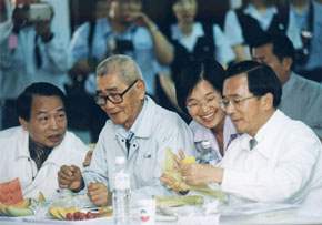 阿扁,上任以來,深入台灣農村無數次,每每聽到農民提及「農友種苗公司」,今日得以親眼目睹,親自品嚐實在非常好吃,可說是台灣農業的十二吋晶圓。貴公司在台灣不但執種苗之牛耳,更揚名於世界各地,這份耀眼的成績是值得慶賀與驕傲,尤其為順應世界潮流,掌控競爭先機,早在新竹工業科學園區投資設立生物科技公司,以進行高科技的研發工作,這種立足台灣、放眼世界的宏觀抱負,令人感佩。