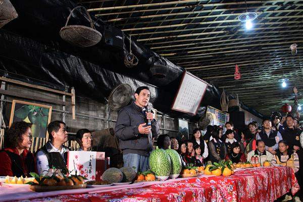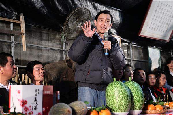 馬英九總統晚間前往新竹縣峨眉鄉拜訪「十二寮休閒農園」黃秀雄班長,在新竹縣長邱鏡淳、鄉長江寧增陪同下,品嚐當地東方美人茶、桶柑及客家美食,並肯定農友們生產品質優良的農作。