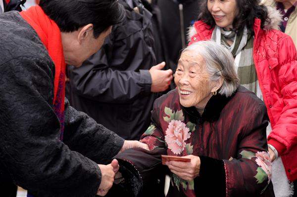 總統致詞結束後也發放福袋,現場氣氛熱鬧歡樂。