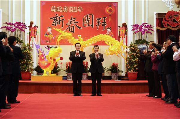 今天是春節假期後第一個上班日,馬英九總統、蕭萬長副總統以及總統府秘書長伍錦霖、副秘書長高朗、劉寶貴等人上午出席「總統府101年新春團拜暨茶會」,與總統府同仁互道新年快樂。