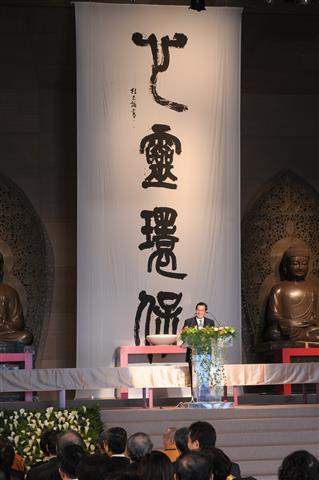 總統致詞時指出,今日是聖嚴法師圓寂三週年紀念日,過去他曾多次向法師請益、對話,深刻感受到聖嚴法師不僅是一位宗教家、更是一位智者;每年除夕,他也都會到法鼓山與國人一同守歲,親身體會聖嚴法師理念的發酵與傳播;聖嚴法師推動「心靈環保」,不但引起社會廣泛迴響,渠所創建的法鼓山更為社會帶來安定力量,將其理念推廣至全世界,發揮臺灣的軟實力,值得高度肯定。