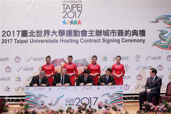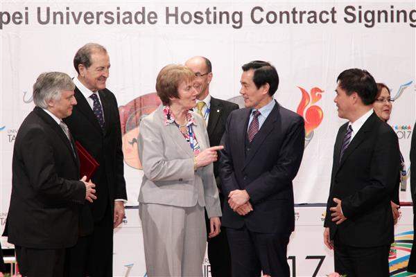 馬英九總統今天下午由行政院體委會主委戴遐齡、教育部長蔣偉寧、臺北市長郝龍斌及中華民國大專院校體育總會會長陳坤檸等陪同出席「2017臺北世界大學運動會主辦城市簽約記者會」,除見證簽約儀式,並期勉主辦單位盡心盡力,讓5年後的本場運動賽事成為有史以來最成功的一次。
