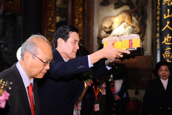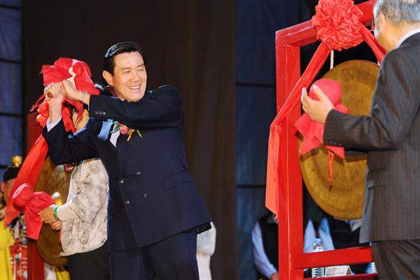 馬英九總統晚間出席「大龍峒保安宮:2012民俗藝術節開鑼式」,高度肯定保安宮重視文化、歷史與藝術,並與內政部次長林慈玲、臺北市副市長陳威仁及保安宮董事長廖武治等人共同敲鑼,為一年一度的「民俗藝術節」揭開序幕。
