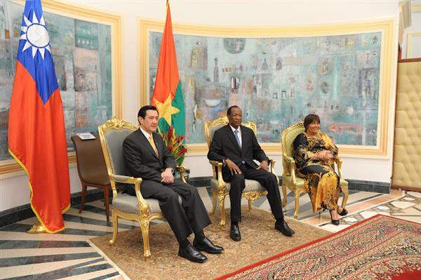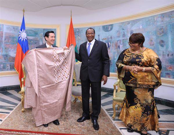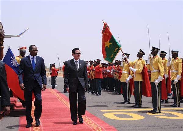 專機停妥後,我駐布國大使張銘忠及布國國家禮賓總局長Leon YOUGBARE登機迎接馬總統,龔保雷(Blaise COMPAORE)總統迎於機梯旁。為表達對馬總統及訪團的隆重歡迎,布國特別施放21 響禮砲,馬總統隨即接受布國少女獻花,繼由龔保雷總統陪同步上受禮臺,接受軍禮歡迎。