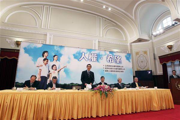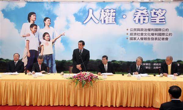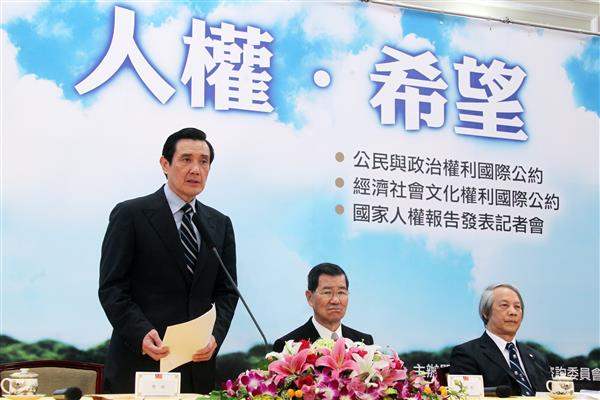 今日參加中華民國建國一百年來,第一份由政府設立的人權委員會所發表的人權報告,個人感到無比欣慰。民國97年我上任後,即努力將1966年聯合國兩個公約—《公民與政治權利國際公約》及《經濟社會文化權利國際公約》變成我國具拘束力之文件,民國98年4月22日我國通過兩公約施行法,將其變成國內法的一部分。目前兩公約已成為我國內法的一部分,對我們具有拘束力,且已於民國98年12月10日生效。雖然我們在1971年失去聯合國的代表權,但我們仍將繼續努力,期使我國人權跟上世界腳步。