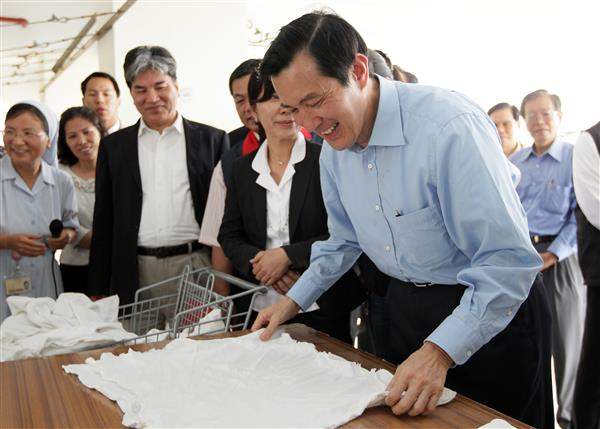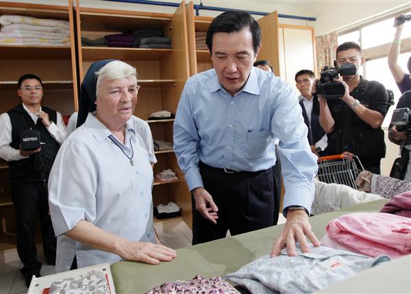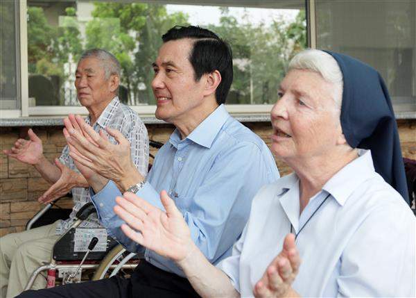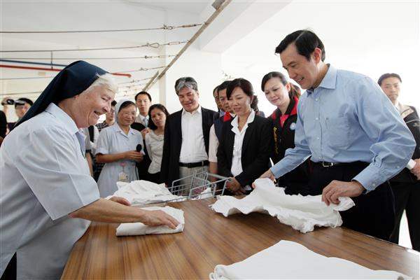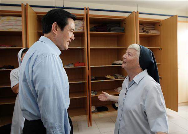 馬英九總統下午前往「天主教仁愛修女會附設臺南市私立老吾老養護中心」訪視潘莉安修女,除肯定潘修女長年在臺奉獻、照料養護中心長輩生活起居,亦致贈加菜金,並重申政府照顧老人的決心。