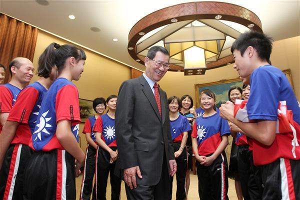 蕭萬長副總統上午接見「梅門功藝坊」參與「2012秘魯國際藝術節」演出小朋友,對梅門子弟此行與世界各國進行養生文化交流、為國爭光,表達肯定與嘉勉之意。