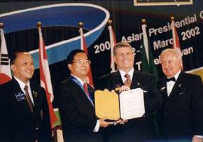 阿扁今天到此,有一種特別的感覺,就像是回娘家一樣,因為阿扁本人就是扶輪社員,一九八七年「三四八○區」的台北北門扶輪社成立沒多久,阿扁就參加其行列。扶輪在台灣發展至今,共有七個地區、約一萬六千名扶輪社員!這個扶輪年度國際扶輪在非洲、美洲及亞洲共召開了四次社長會議,這次是最後一次會議,而亞洲會議獨獨選定在台北,顯示了國際扶輪對台灣扶輪運動的肯定,以及對台灣扶輪社員籌辦國際會議能力的信賴,身為扶輪大家庭的一員,阿扁深感與有榮焉。