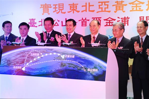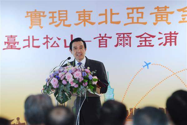 馬英九總統上午前往松山機場出席「臺北(松山)—首爾(金浦)航線開航典禮」,除肯定航線開航完成「東北亞黃金航圈」、落實我開放天空政策,並期盼持續深化臺韓關係。