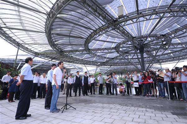 總統致詞時表示,「六堆客家文化園區」為一座兼具環保與節能減碳的綠建築,同時保存了傳統客庄文化,先前雖因工程履約問題,完工期程有所延宕,但在去年10月已正式啟用,截至今年農曆春節期間,園區共吸引逾一百萬人入園參觀,如加上五月十二日即將開幕的苗栗客家園區,屆時兩處園區勢必成為臺灣重要的觀光景點。