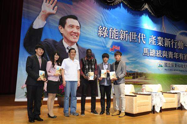 馬英九總統下午前往屏東科技大學與該校學生座談,並以「綠能新世代,產業新行動」為題發表演說,鼓勵學生挖掘「腦礦」,激發創意,同時強調節能減碳不僅涉及公德,更是國家政策;總統也就「大學學費調漲」、「大專院校與技職體系學校資源分配不均」及「外交拓展」等議題與學生討論交流。