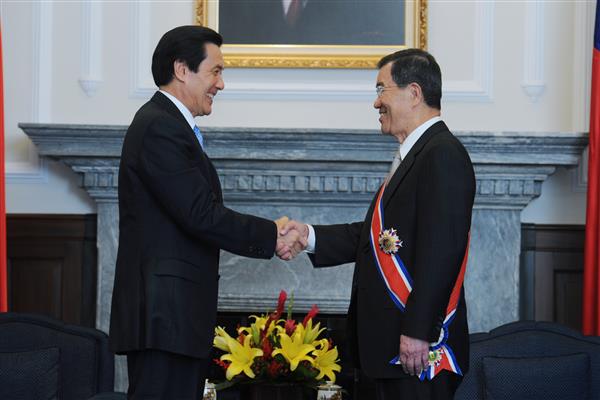馬英九總統上午頒授蕭萬長副總統「中正勳章」,以表彰其長期以來對國家與社會的卓越貢獻。