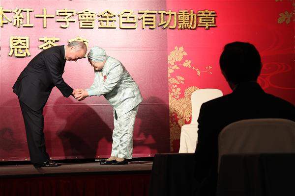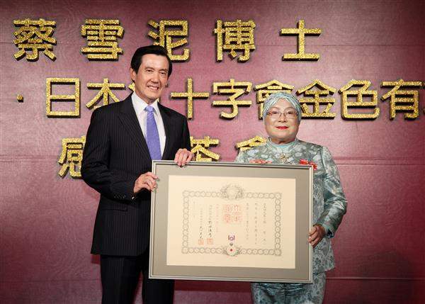 馬英九總統下午出席「蔡雪泥國策顧問獲贈日本紅十字會金色有功勳章感恩茶會」時,特別恭賀蔡雪泥女士連續榮獲日本官方頒贈「旭日小綬章」及紅十字會「金色有功勳章」兩項殊榮,並推崇其長年投諸公益及推動臺日交流之卓越貢獻 。