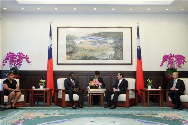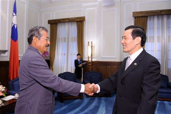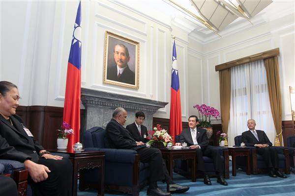 為祝賀我國第13任總統、副總統宣誓就職典禮,我國南太平洋友邦帛琉共和國、索羅門群島及吐瓦魯等三國致賀團,上午分別前來總統府會見總統,包括副總統當選人吳敦義、外交部長楊進添等人均在座陪同。