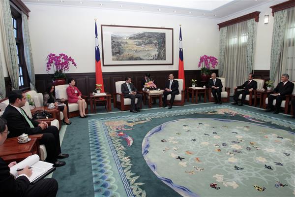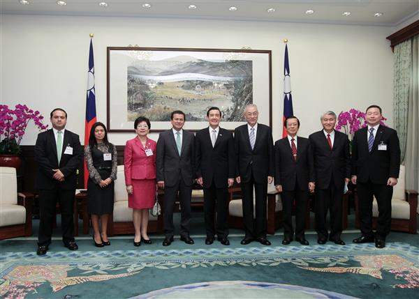 為祝賀我國第13任總統、副總統宣誓就職典禮,我中美洲友邦薩爾瓦多、聖克里斯多福及尼維斯等二國致賀團,午間前來總統府會見總統,包括副總統當選人吳敦義、外交部長楊進添及次長柯森耀等人也在座陪同。