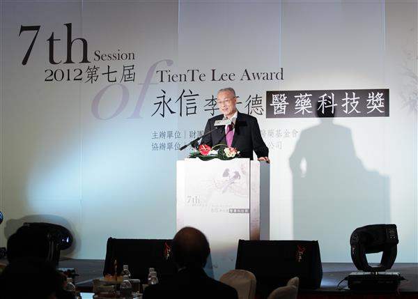 吳敦義副總統下午出席「2012第七屆永信李天德醫藥科技獎」頒獎典禮暨得獎人聯誼會會員大會,親自頒獎表彰傑出研究學者於生技醫療領域之貢獻,並再次重申政府推動生技產業發展的決心。