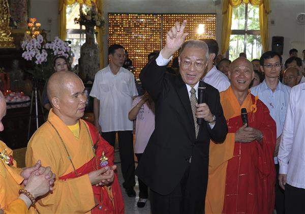 副總統說,鎮國寺長期致力於淨化人心、和諧社會,因此贈送該寺「鎮國安民、廣施博愛、心向佛祖」詩句,以表肯定。