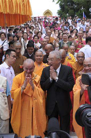 之後,副總統前往南投縣集集鎮的「世界和平塔--鎮國寺」,出席「世界念佛救地球法會」,祈求國泰民安、風調雨順。