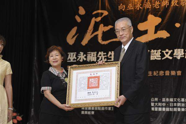吳敦義副總統上午專程前往南投縣,出席「泥土‧文學--巫永福先生百歲冥誕文學紀念活動」,並代表馬總統頒發褒揚令給出身南投埔里的文學前輩,也是臺灣文壇國寶巫永福先生,以表彰耆老典範及對國家社會的貢獻;褒揚令由巫永福家屬代表--「巫永福文化基金會」董事長巫宜蕙接受。