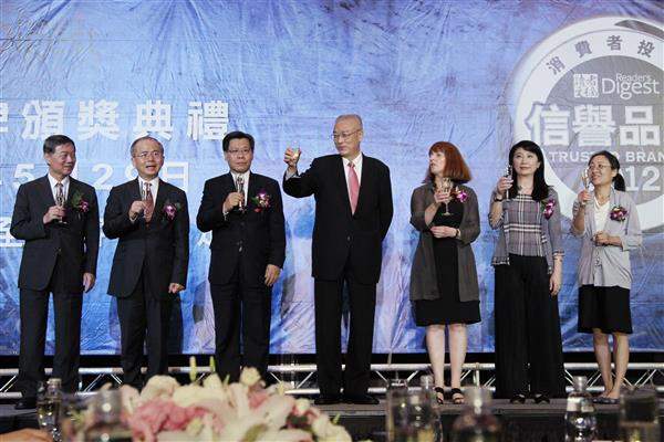 吳敦義副總統下午出席「讀者文摘信譽品牌頒獎典禮」,除與《讀者文摘》亞洲區總編輯Sue Carney、經濟部次長梁國新及國貿局副局長陳銘師共同舉杯祝賀《讀者文摘》90歲生日,並親自頒發「最受信任電視節目主持人獎」。
