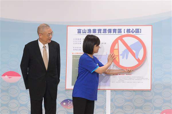 隨後,副總統親自把「海洋保護區」分類標誌--「禁止進入或影響」、「禁止採捕」及「分區多功能」三種標誌,分別授與海洋大學學生,以象徵我國守護海洋的傳承意義。
