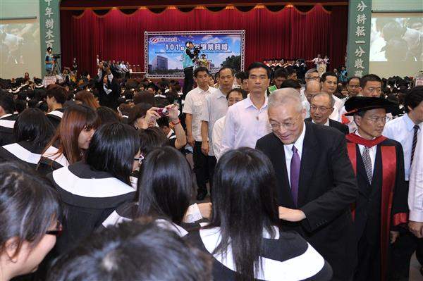 吳敦義副總統今天訪視高雄,分別出席「義守大學」、「正修科技大學」、「南臺科技大學」及「高雄師範大學」等4所大學畢業典禮,除祝福所有畢業生鵬程萬里、前途似錦,並期勉他們培養職場競爭力,為社會注入創意新活力,實現宏遠夢想,邁入人生新的里程碑。