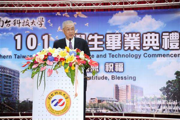 稍後,副總統由「南臺科技大學」校長戴謙、副校長吳新興、董事張麗堂及行政院南部聯合服務中心副執行長林清強等人陪同,出席該校畢業典禮,於致詞時表示,前國策顧問吳三連老先生,為響應政府鼓勵私人興學,40多年前創立了「南臺工專」;目前該校已成為臺灣私立科技大學的龍頭,數萬名師生的努力與堅持,讓南臺科大成為名符其實的第一流學府。