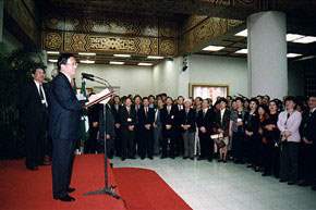 阿扁今天有機會設宴款待回國參加「世界台灣人大會」第二次年會的各位海外鄉親代表,感到十分親切與歡喜,同時也要再一次代表政府和人民,對各位長期關懷故鄉的熱忱,表達最高的敬意和謝意。