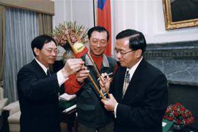 清淨國土淨人心後勤支援總部團長張國雄、首席顧問沈竹雄、特別顧問林回復、徐鴻煥、莊蒼鎮、洪明賢、林滄喜、鄭世雄、郭李桂香、王進山、劉得彩、陳泳易、陳王根、陳峰敏、劉明宗、王木松、王朝煌、鄭永和、吳政宏等一行,上午由發起人林明德率團,前來總統府晉見總統。總統府副秘書長陳哲男也在座。