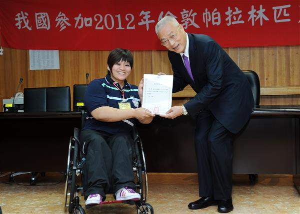 隨後,副總統分別頒發桌球、柔道、健力、射擊、射箭、游泳及田徑等聘書給國家代表隊教練及選手當選證書。包括行政院體育委員會主任委員戴遐齡、副主任委員陳雲蓮、「中華民國殘障體育運動總會」會長賴復寰、「2012年倫敦帕拉林匹克運動會」代表團團長陳李綢、總領隊張昭盛及副總領隊蔡有仁等人均出席是項活動。
