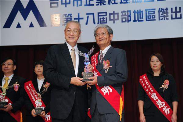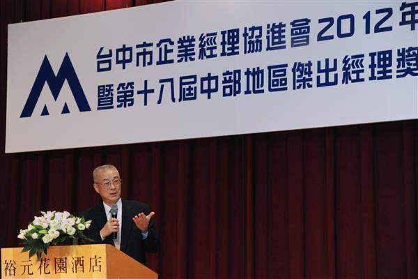 吳敦義副總統下午前往臺中市出席「臺中市企業經理協進會」2012年會員大會暨第18屆中部地區傑出經理頒獎典禮,親自頒發伯樂獎及傑出經理獎予12位得獎人。