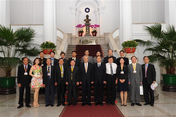 訪賓一行約80人由「中華創新發明學會」理事長吳國俊率領、經濟部次長卓士昭陪同,前來總統府接受副總統道賀。