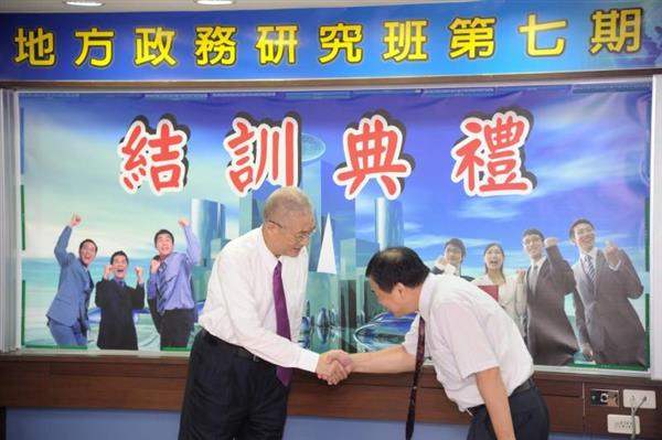 吳敦義副總統下午前往南投縣中興新村,出席由行政院人事行政總處地方研習中心所主辦的「地方政務研究班」第7期結訓典禮,除肯定主辦單位讓地方行政團隊的高階主管透過訓練培育,得以提升素質、精實壯大,成為提振國家競爭力及協助縣市首長推動政務的新動力,並期盼中央與地方政府能共同努力,持續在革新中追求進步,在傾聽及關懷中帶給國人幸福。
