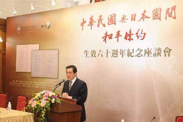 今天是《中日和約》生效60週年,馬英九總統上午應邀前往當年簽約地點-臺北賓館出席紀念活動,並針對近日釣魚臺列嶼爭議可能影響東北亞穩定局勢,提出「東海和平倡議」,呼籲相關各方應自我克制,不升高對立行動;應擱置爭議,不放棄對話溝通;應遵守國際法,以和平方式處理爭端;應尋求共識,研訂「東海行為準則」;應建立機制,合作開發東海資源。