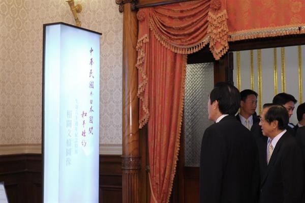 談及臺日關係,總統表示,他上任後即將對日關係定位為「特别夥伴關係」,4年多來,兩國在青年交流、札幌設處、投資協議、開放天空各方面,已有具體成果;日本國會更修正與制定法律,讓旅日僑胞更受到尊重,並排除我故宮文物赴日展出的障礙。此外,民國100年日本東北大地震後,臺灣民眾熱情捐輸、全球第一,雙方嗣後發表「厚重情誼倡議」,雙邊合作關係更趨緊密,係近40年來所罕見。