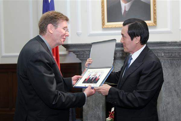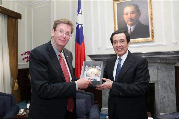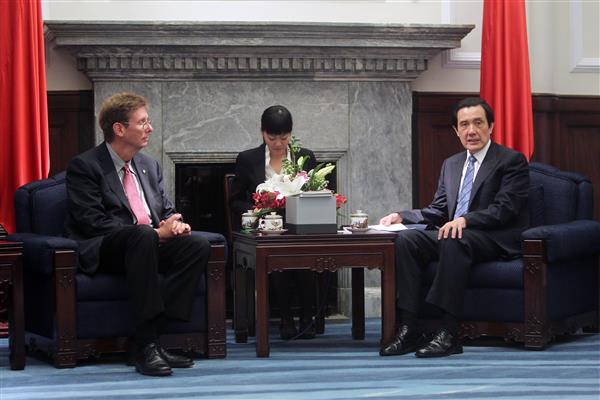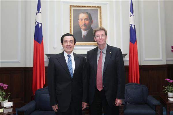 卡爾森博士由行政院國家科學委員會主任委員朱敬一陪同,前來總統府晉見總統,國家安全會議副秘書長楊永明也在座。