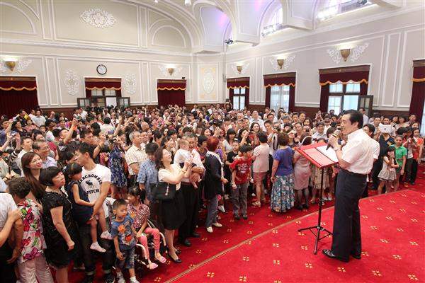 總統致詞時表示,第一次在總統府大禮堂看到這麼多員工眷屬,尤其現場有許多小朋友,有些已逐漸長大,有些則是新生兒,雖然父親節昨(8)日剛過,但仍要祝福所有與會的父親們平安幸福,並盼大家度過愉快的一天。