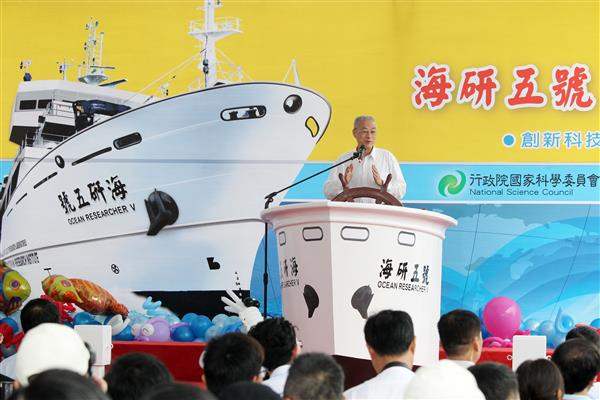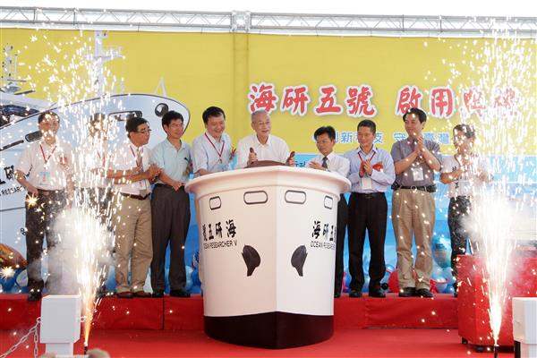 吳敦義副總統上午前往高雄市光榮碼頭,出席「海研五號」研究船啟用典禮,期盼該船未來肩負起支援基礎學術研究、強化海洋教育及培育海洋科技研究人才之重任,為實現「海洋立國」的我國海洋科技帶來嶄新的一頁。