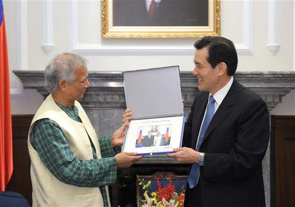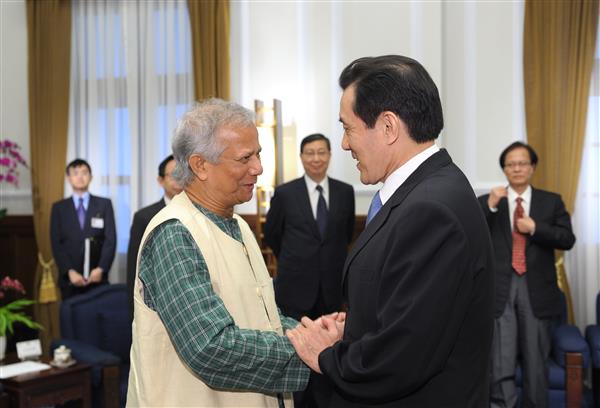 馬英九總統上午接見國際趨勢大師暨2006年諾貝爾和平獎得主穆罕默德.尤努斯(Muhammad Yunus)教授,對彼創辦「鄉村銀行」,推動「社會企業」表示推崇,也對彼此次受邀來臺發表專題演講,代表我政府與人民表達誠摯歡迎之忱。