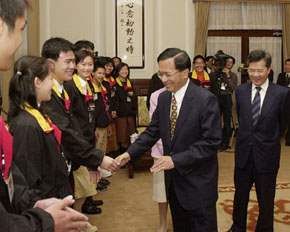 陳總統水扁先生今天上午接見「二○○一年青少年義工菁英獎」得獎同學,除了嘉許志工們是台灣的「守護天使」外,也與獲獎的青少年義工們相約在今年的五二○當天,一起與他同步在全台灣做義工,共同實現「台灣之子青春夢」志工台灣的理念。