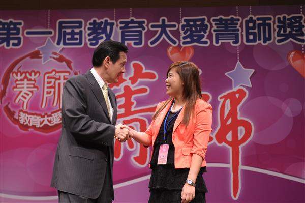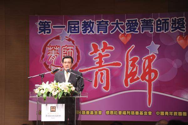 馬英九總統上午出席第1屆教育大愛「菁師獎」表揚大會,並親自頒發獎項,向獲獎教師積極幫助弱勢孩童的努力與付出,表達高度肯定與感謝之意。